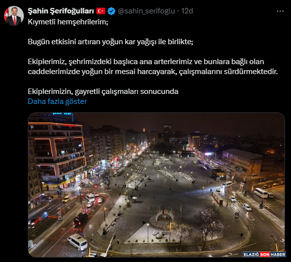 Başkan Şerifoğulları, “Kıymetli hemşehrilerim; Bugün etkisini artıran yoğun kar yağışı ile birlikte; Ekiplerimiz, şehrimizdeki başlıca ana arterlerimiz ve bunlara bağlı olan caddelerimizde yoğun bir mesai harcayarak, çalışmalarını sürdürmektedir. Ekiplerimizin, gayretli çalışmaları sonucunda ulaşımda herhangi bir aksama yaşanmamaktadır. Yoğun kar yağışı ve buzlanma riskine karşı hemşehrilerimizin dikkatli olmalarını, trafiğe çıkacak araçlarına mutlak suretle kar lastiği takmalarını önemle rica ediyorum” dedi.