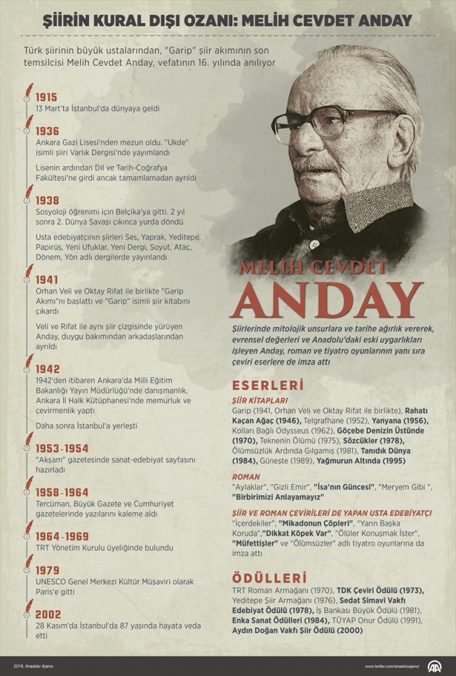 sta şair ve yazar Melih Cevdet Anday, 13 Mart 1915'te dünyaya geldi.