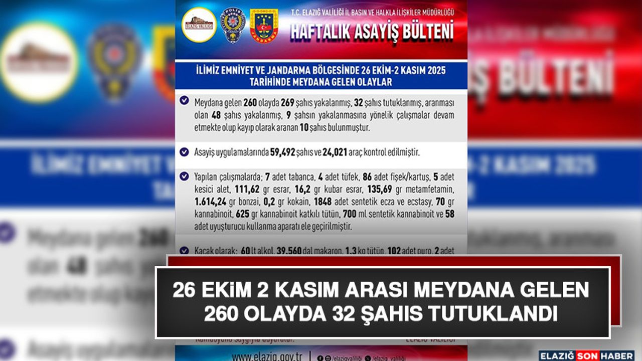 Paylaşılan verilere göre Elazığ genelinde 1 haftalık süreçte 260 olay meydana geldi. Bu olaylarda 269 şahıs yakalanırken 32 şahıs tutuklandı. Kent genelinde yapılan kontrollerde araması olan 48 şahıs yakalanmıştır.