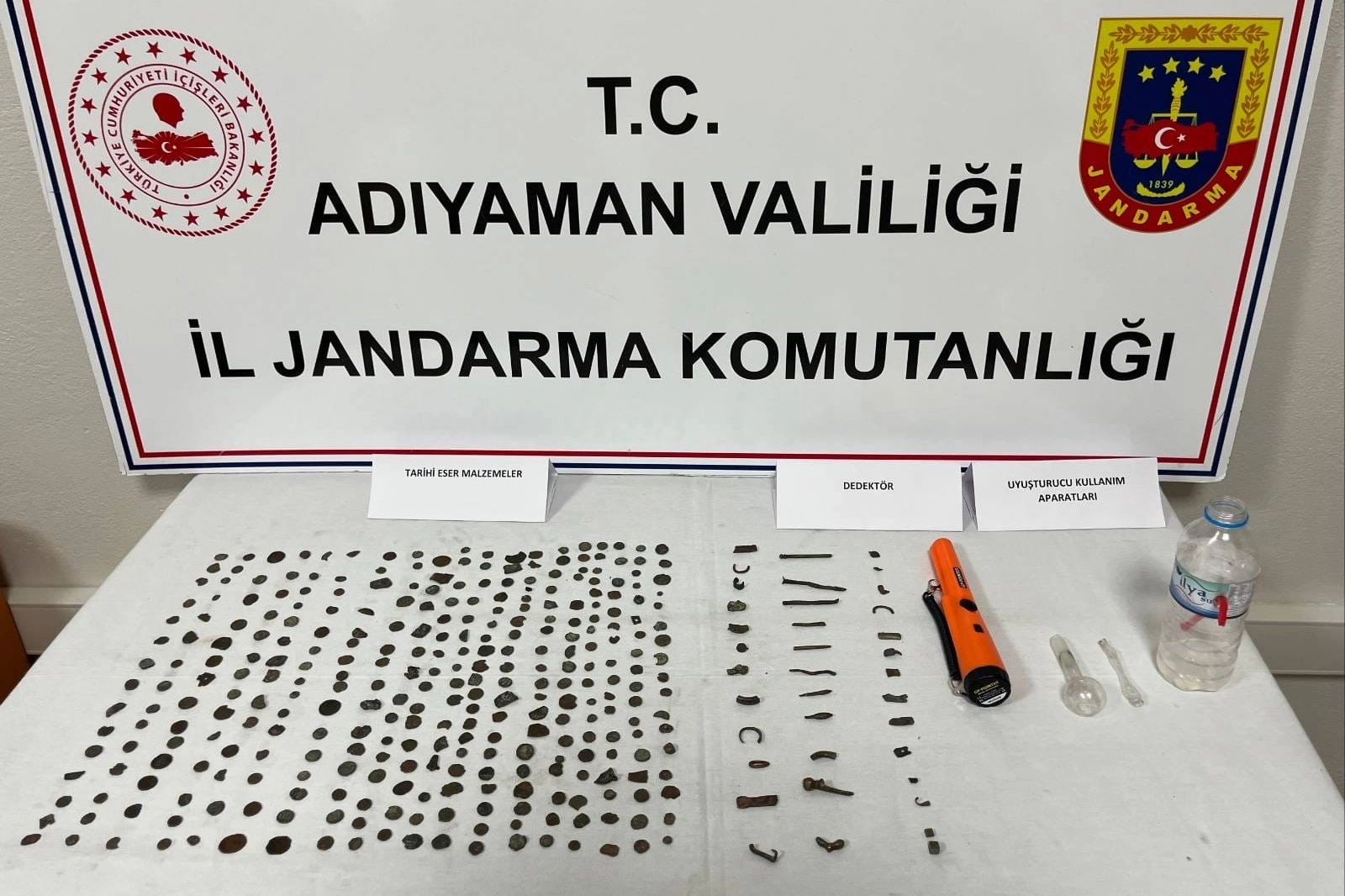 Adıyaman İl Jandarma Komutanlığı ekiplerince gerçekleştirilen operasyonda, tarihi eser kaçakçılığına yönelik önemli bir başarıya imza attı.ADIYAMAN (İGFA) - Alınan bilgiye göre A.A. adlı şahsın tarihi eser kaçakçılığı yaptığı tespit edilmesi üzerine düzenlenen operasyonda, 306 adet sikke, 43 adet obje, 1 adet dedektör ile birlikte 2 adet payp ve 1 adet pet şişe düzeneğinde uyuşturucu kullanma aparatı ele geçirildi.