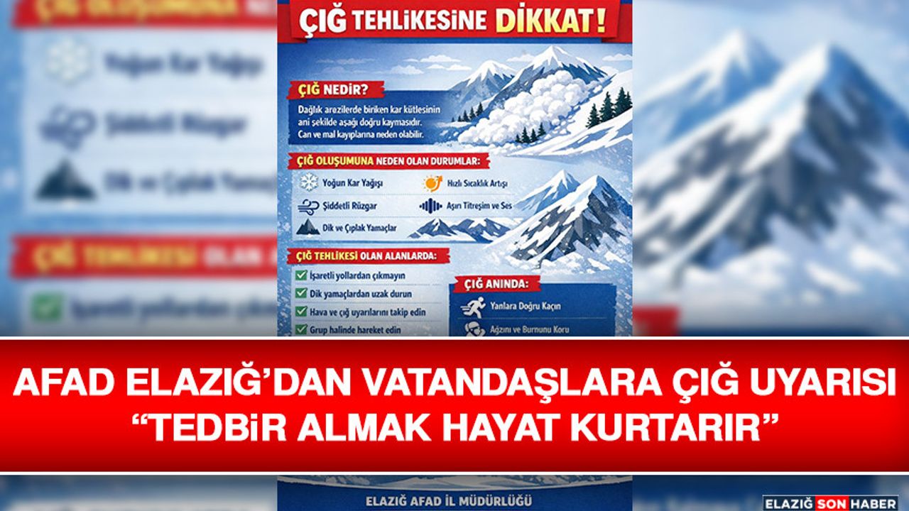 Elazığ AFAD İl Müdürlüğü, sosyal medya hesabından yaptığı paylaşımda vatandaşları çığ tehlikesine karşı uyardı. Açıklamada, özellikle dağlık ve yüksek kesimlerde yaşayan ya da bu bölgelere seyahat eden vatandaşların dikkatli olması gerektiği vurgulandı.