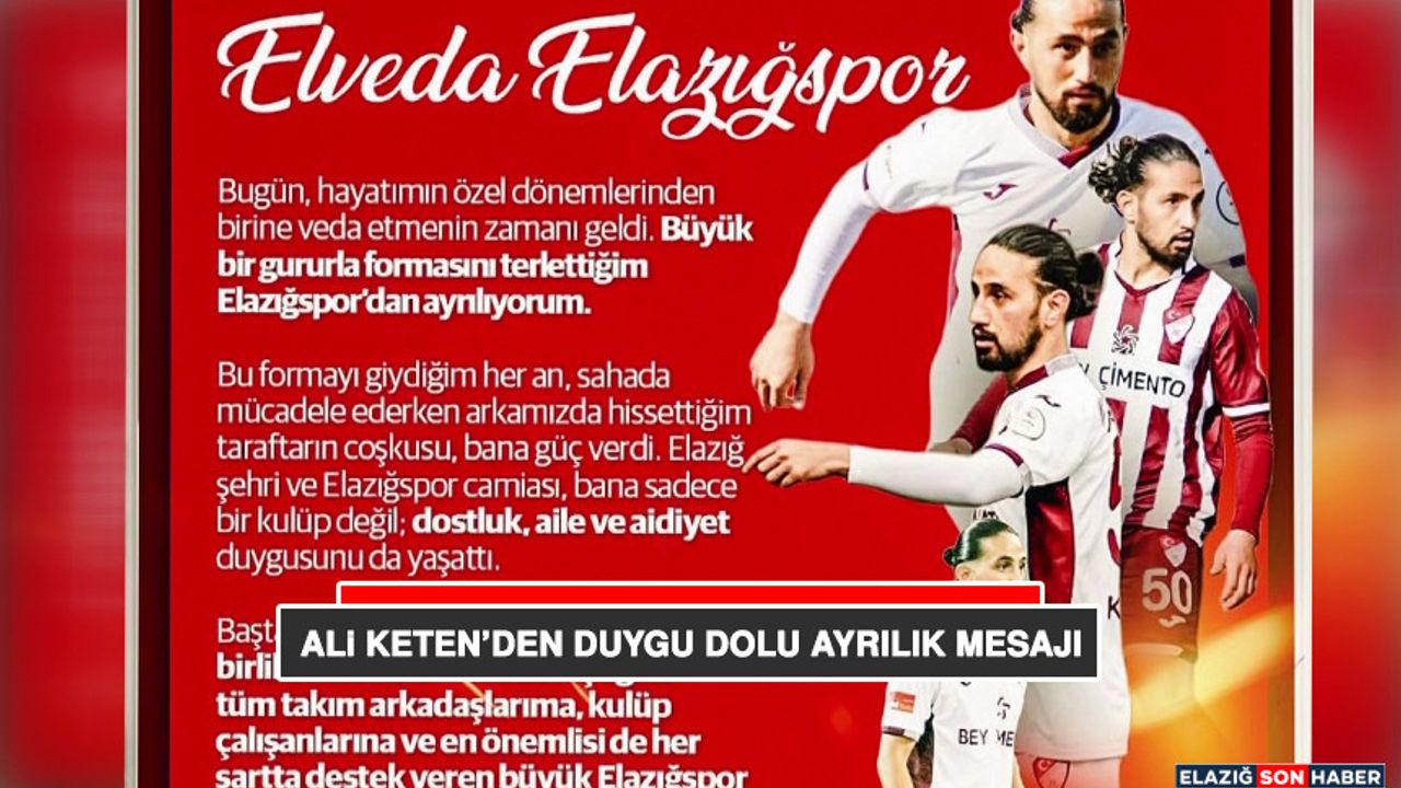 Ali Keten yayınladığı veda mesajında;” Bugün hayatımın özel dönemlerinden birine veda etmenin zamanı geldi. Büyük bir gururla formasını terlettiğim Elazığspor’dan ayrılıyorum. Bu formayı giydiğim her an, sahada mücadele ederken arkamızda hissettiğim taraftarın coşkusu, bana güç verdi. Elâzığ şehri ve Elazığspor camiası bana sadece bir kulüp değil; dostluk, aile ve aidiyet duygusunu da yaşattı. Başta teknik ekiplerimiz olmak üzere, birlikte omuz omuza savaştığım tüm takım arkadaşlarıma, kulüp çalışanlarına ve en önemlisi de her şartta destek veren Elazığspor taraftarına sonsuz teşekkür ederim. Bu süreçte edindiğim dostluklar ve anılar, hep kalbimde olacak. Her şey için teşekkürler…” ifadelerini kullandı.