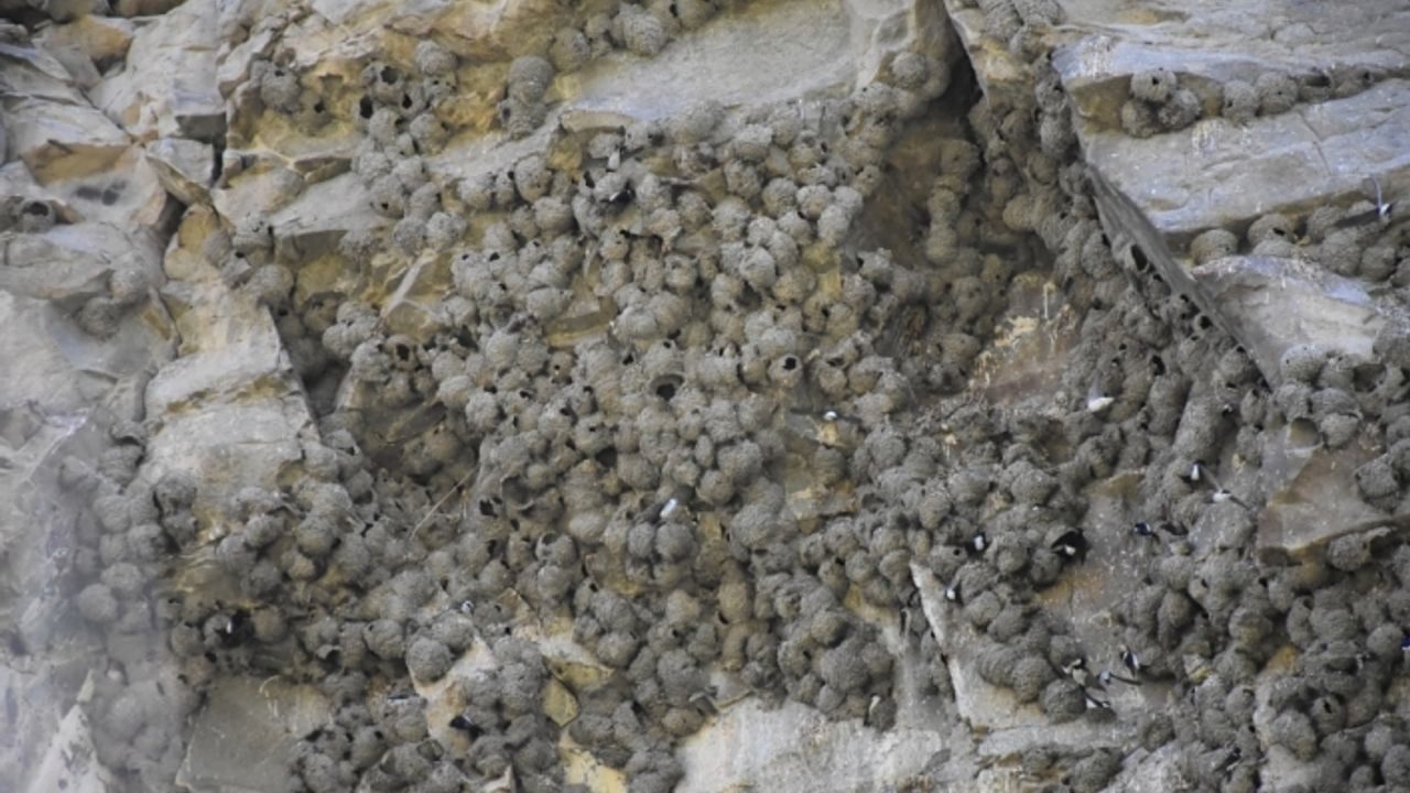 Kayalıkların üst kısmına taşıdıkları çamurla yuva yapan yüzlerce kırlangıç, yaz dönemini burada geçirdikten sonra göç ediyor.