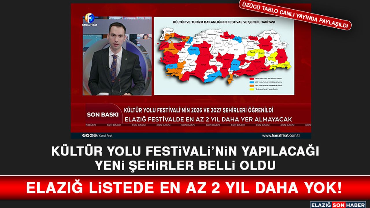 Kültür ve Turizm Bakanlığı tarafından düzenlenen ve düzenlenecek olan festival ve şenliklerin yer aldığı harita ekranlara getirilerek Elazığ’ın çevresindeki tüm şehirlerde bakanlık tarafından festival veya şenlik yapıldığı gösterildi. Elazığ’ın çevresindeki tüm illerde festival veya şenlik düzenlendiği görülürken, Elazığ’ın programda olmaması dikkat çekti.