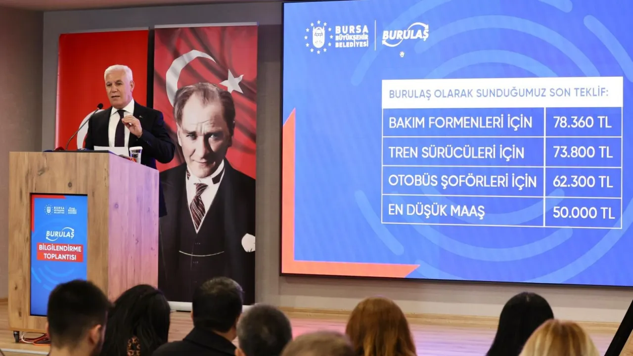 Bursa Büyükşehir Belediye Başkanı Mustafa Bozbey, BURULAŞ toplu iş sözleşmesi sürecinde son tekliflerini açıklayarak, sendikanın yüzde 47 zam talebinin sürdürülebilir olmadığını belirtti. Bozbey, “Mali disiplin ve hizmet sürekliliği için toplu taşıma ücretlerine zam yapamayız” dedi.BURSA (İGFA) - Bursa Büyükşehir Belediye Başkanı Mustafa Bozbey, BURULAŞ’taki toplu iş sözleşmesi görüşmelerine ilişkin kamuoyuna bilgi verdi.