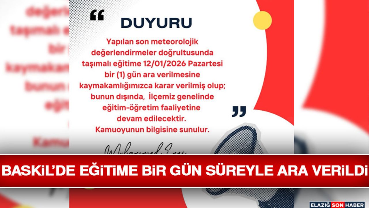 Baskil Kaymakamlığı, yapılan son meteorolojik değerlendirmeler doğrultusunda taşımalı eğitim gören öğrenciler için 12 Ocak 2026 Pazartesi günü eğitime bir gün ara verildiğini duyurdu.