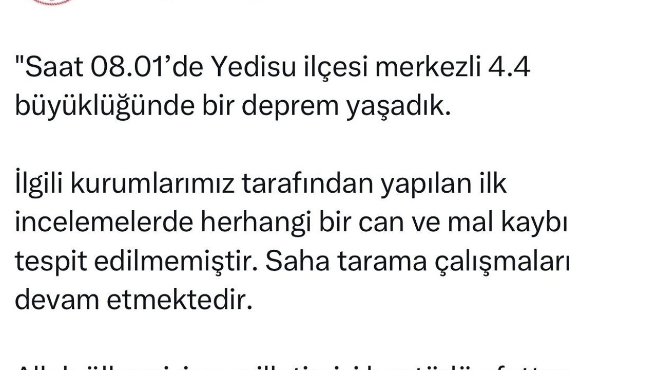 Depremin ardından Bingöl Valiliği'nden yapılan açıklamada, 'Saat 08.01'de Yedisu ilçesi merkezli 4.4 büyüklüğünde bir deprem yaşadık. İlgili kurumlarımız tarafından yapılan ilk incelemelerde herhangi bir can ve mal kaybı tespit edilmemiştir. Saha tarama çalışmaları devam etmektedir. Allah ülkemizi ve milletimizi her türlü afetten korusun' denildi.