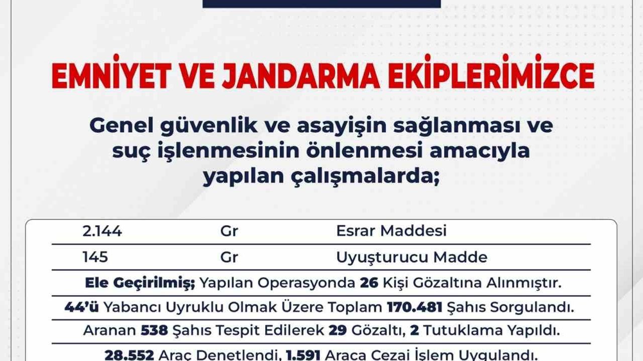 Bingöl’de emniyet ve jandarma ekiplerince genel güvenlik ve asayişin sağlanması ve suç işlenmesinin önlenmesi amacıyla çalışmalar sürüyor. Bu çerçevede 10-24 Şubat tarihleri arasında yapılan çalışmalarda 44’ü yabancı uyruklu olmak üzere toplam 170 bin 481 şahıs sorgulandı. Aranan 538 şahıs tespit edilerek 29 gözaltına alınırken 2’si tutuklandı. 28 bin 552 araç denetlenirken bin 591 araca cezai işlem uygulandığı ve 55 aracın trafikten men edildiği bildirildi. Ayrıca 2.144 gram esrar maddesi, 145 gram uyuşturucu madde ele geçirildi, yapılan operasyonda 26 kişi gözaltına alındı. Uygulamalarda 7 adet ruhsatsız av tüfeği, 116 adet av tüfeği fişeği, 4 adet tabanca, 12, adet fişek, 2 adet kuru sıkı tabanca ve 2 adet hassas terazinin ele geçirildiği aktarıldı.