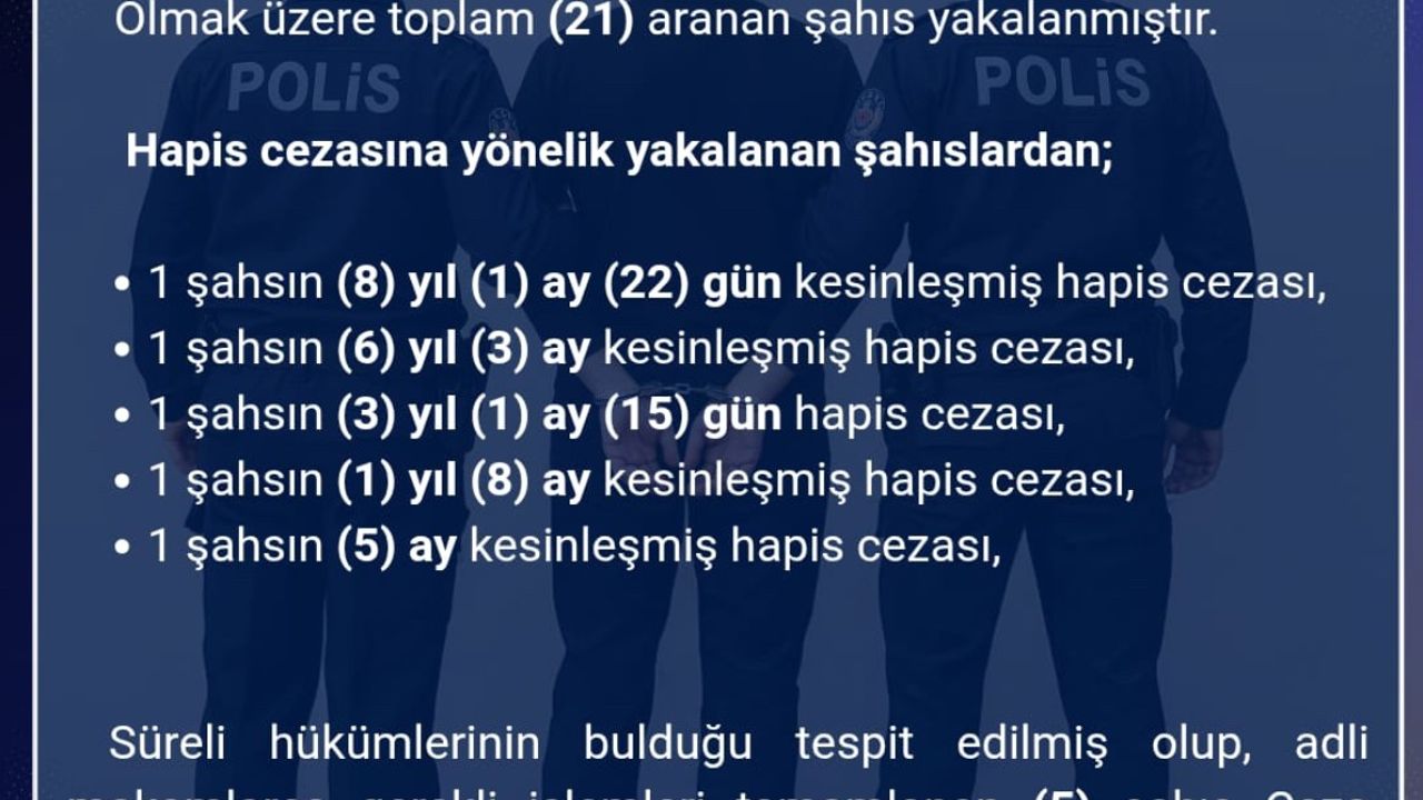 Edinilen bilgilere göre, İl Emniyet Müdürlüğü ekipleri kent genelinde aranan şahısların yakalanmasına yönelik çalışmalar yaptı. Çalışmalarda çeşitli suçlardan aranan 21 şahıs gözaltına alındı. Emniyetteki işlemlerinin ardından adli mercilere sevk edilen şüphelilerden 5’i çıkarıldıkları mahkemece tutuklanarak cezaevine gönderildi.