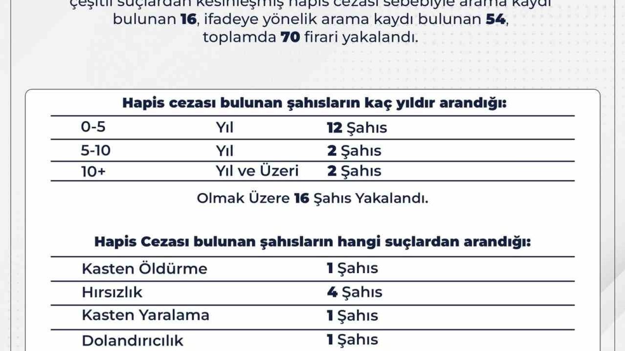 BİNGÖL (İHA) – Bingöl’de aranan şahıslara yönelik gerçekleştirilen operasyonlarda firari olan 70 şahıs yakalandı.