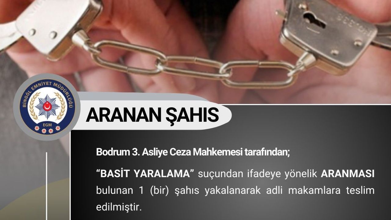 Bingöl Emniyet Müdürlüğünden yapılan açıklamada haklarında ifadeye ve para cezasına yönelik aranması bulunan 11 şahsın yakalandığı belirtildi. Çalışmaların kararlılıkla devam edeceği kaydedildi.