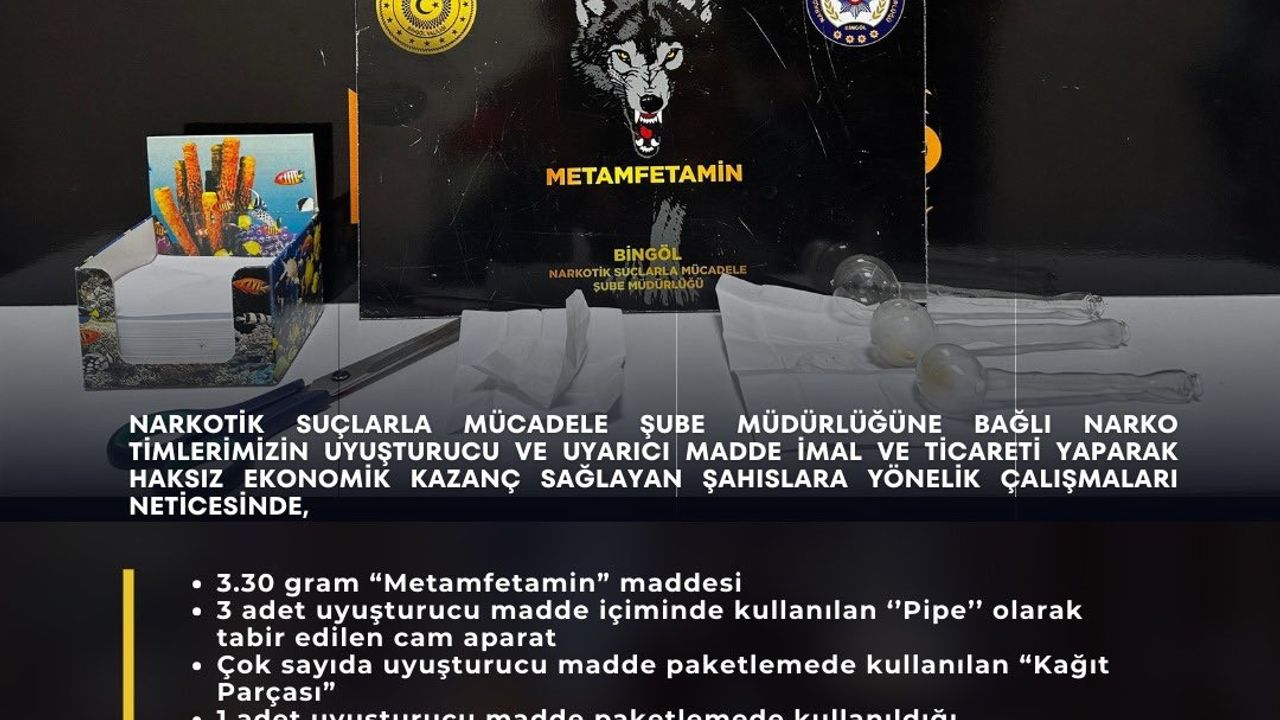 Bingöl Emniyet Müdürlüğü Narkotik Suçlarla Mücadele Şube Müdürlüğüne bağlı narko timlerince uyuşturucu ve uyarıcı madde imal ve ticareti yapan şahıslara yönelik operasyon gerçekleştirildi. Operasyonda 3.30 gram metamfetamin, 3 adet uyuşturucu madde içiminde kullanılan pipe olarak tabir edilen cam aparat, çok sayıda uyuşturucu madde paketlemede kullanılan kağıt parçası, 1 adet uyuşturucu madde paketlemede kullanıldığı değerlendirilen makas, uyuşturucu madde ticaretinden elde edildiği değerlendirilen bin 675 lira ele geçirildi. Operasyonda yakalanan 1 şahıs tutuklanarak cezaevine gönderilirken, 1 şahıs hakkında da adli işlem başlatıldı.