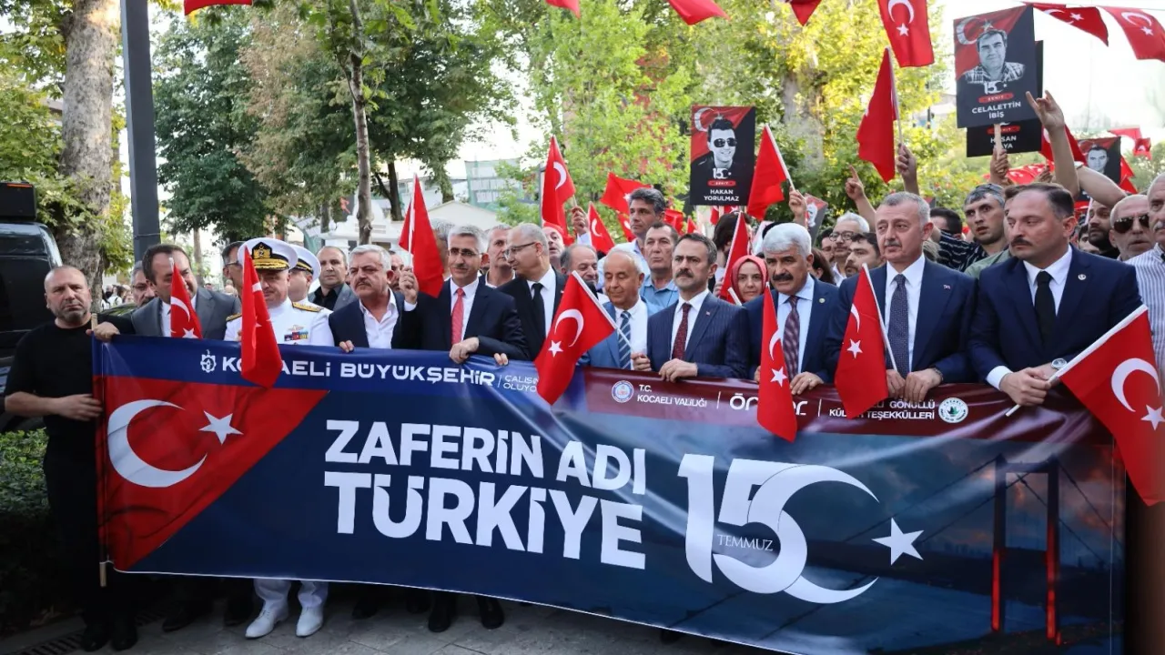 Kocaeli Valiliği, Kocaeli Büyükşehir Belediyesi ve sivil toplum kuruluşlarının 15 Temmuz dolayısıyla birlikte düzenlediği "Zaferin Adı Türkiye" yürüyüşü gerçekleştirildi. Binlerce Kocaelili 9 yıl önce olduğu gibi 15 Temmuz heyecanını kaybetmediklerini gösterdi.KOCAELİ (İGFA) - 15 Temmuz’un 9. yılında Kocaeli, bir kez daha tarih yazdı. “Zaferin Adı Türkiye” kortej yürüyüşüne binlerce vatandaş akın etti. Kadın, erkek, yaşlı, genç, çocuk demeden herkes ellerinde Türk bayraklarıyla meydanlara koştu. Tıpkı 9 yıl önceki gibi milletin tek yürek olduğu bu yürüyüşte, birlik ve beraberlik en güçlü haliyle hissedildi.