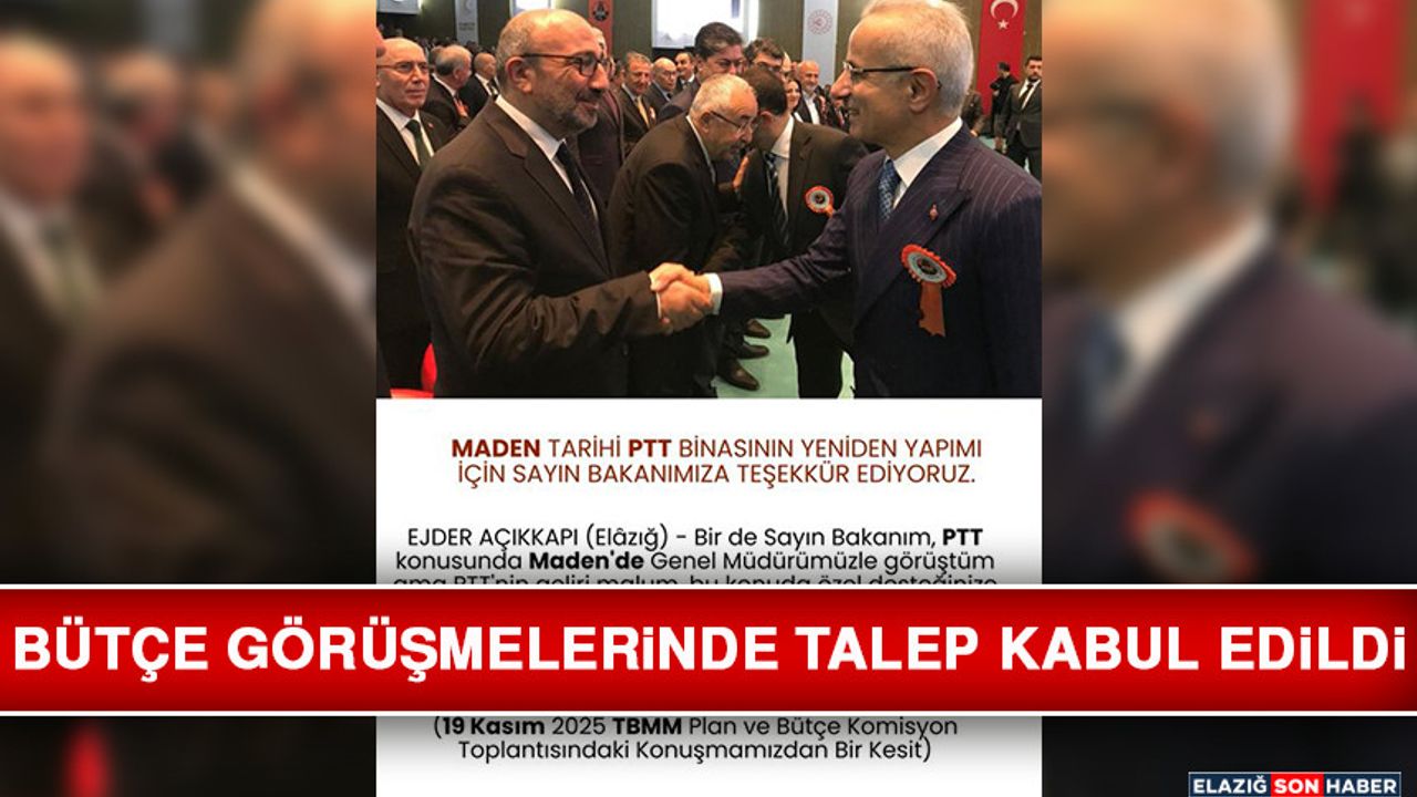 Açıkkapı açıklamasında, “Maden İlçemizin tarihi PTT binasıyla ilgili talebimizi hem Bakanlık nezdinde hem de Plan ve Bütçe Komisyonu’nda dile getirdik. İlçemizin tarihi kimliğini ve sosyal hayatını canlandıracak bu önemli yatırım, bütçe sürecinde karşılık bulmuştur” dedi.