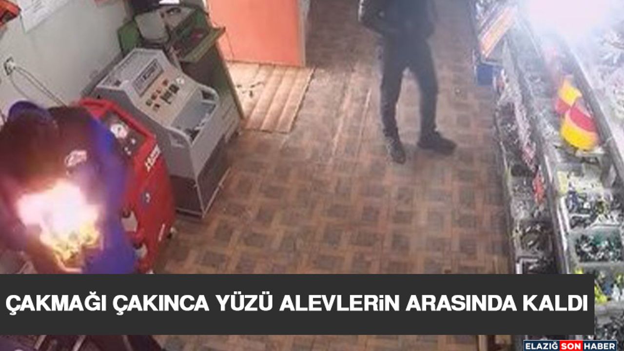 Olay, bir oto elektrik dükkanında meydana geldi. Edinilen bilgiye göre, dükkanda çalışan bir işçi, kabloyu eritmek için çakmağı çakınca o sırada elinde bulunan yapıştırıcı sprey bir anda alev aldı. Yüzü kısa süreliğine alevler arasında kalan çalışan, sprey kutusunu yere attı. Kısa bir şokun ardından kendine gelen çalışan, yerde yanan sprey kutusunu alarak dışarı attı. O anlar kameralara yansıdı.