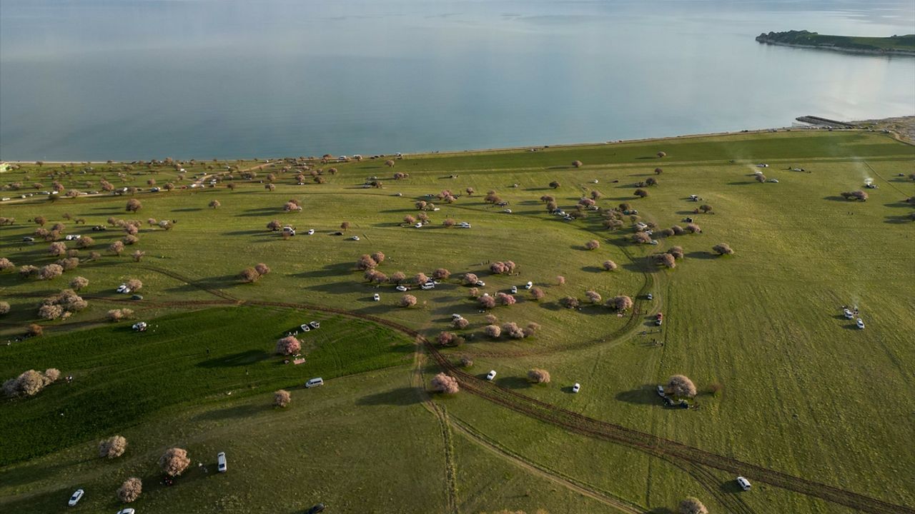 Van Gölü'nün kuzeydoğusunda yer alan yarımada, ağaçların çiçek açması ve doğanın canlanmasıyla seyrine doyum olmayan manzaraya büründü.