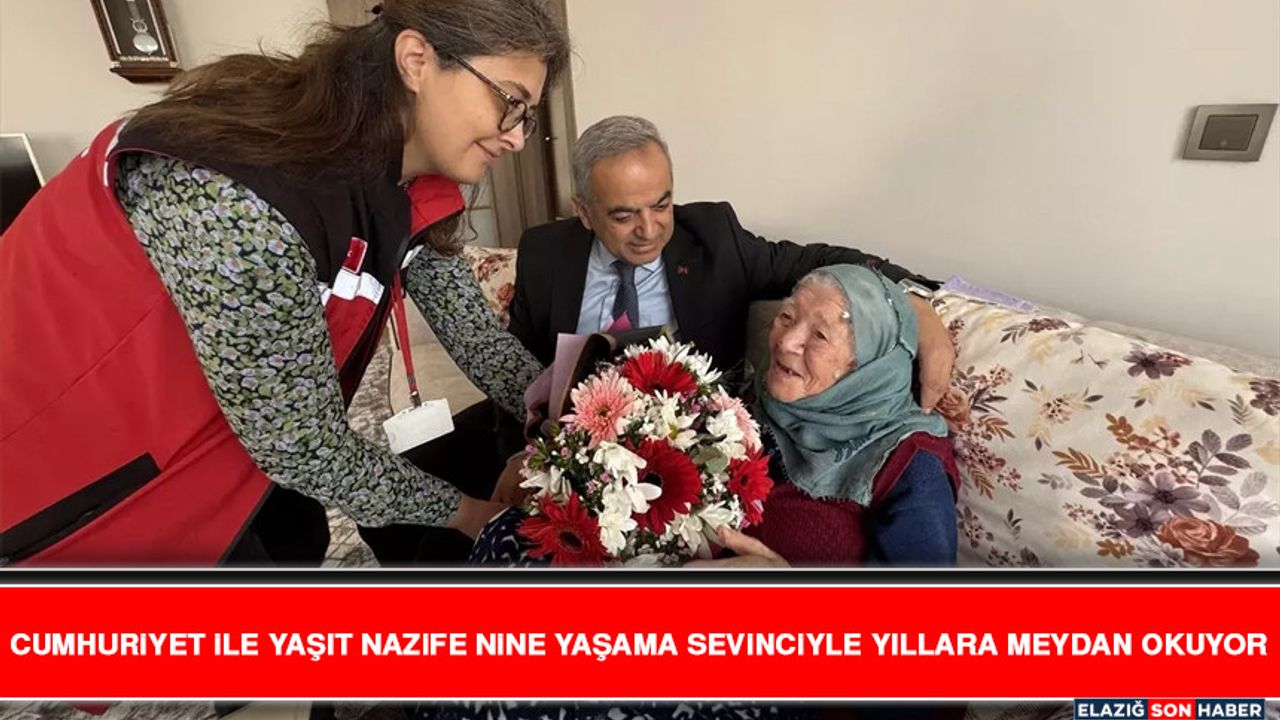 Elazığ Aile ve Sosyal Hizmetler İl Müdürü Ömer Faruk Ergün ve beraberindeki kurum personeli, Cumhuriyet'in 102'nci yılı dolayısıyla üzerinde "Cumhuriyet'imiz ve Nazife teyzemiz 102 yaşında" yazılı pasta ile Gül'ü evinde ziyaret etti.