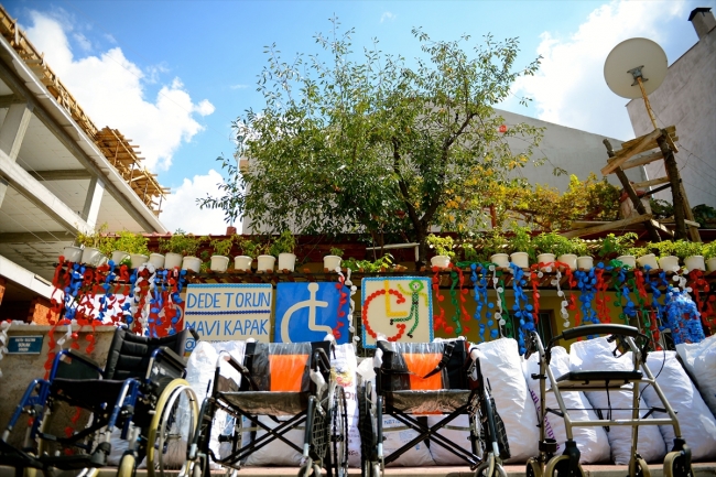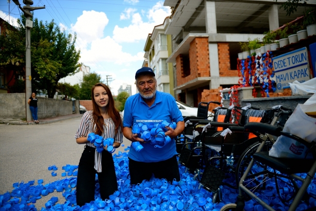 Sosyal medyada "Dede torun mavi kapak" adıyla açtıkları hesap sayesinde Eskişehir'in yanı sıra Türkiye'nin birçok ilinden kargo yoluyla plastik kapak bağışı kabul eden dede torun Halit Aydoğan ve 16 yaşındaki Melike Sarıtaş, bu projeyle 129 bedensel engelliye tekerlekli sandalye hediye etti.