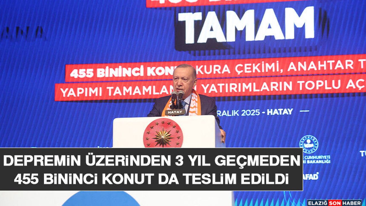 Konuşmasında devletin tüm imkanlarıyla deprem bölgesinde olduğunu ifade eden Cumhurbaşkanı Erdoğan, “Depremin vurduğu on bir ilimizde yapımı tamamlanan 455 bininci afet konutumuzu hak sahibi kardeşlerimize teslim etmenin gururunu yaşıyoruz” dedi. Elazığ’da da deprem sonrası yürütülen çalışmalar kapsamında binlerce konutun tamamlanarak hak sahiplerine teslim edildiğine dikkat çekildi.