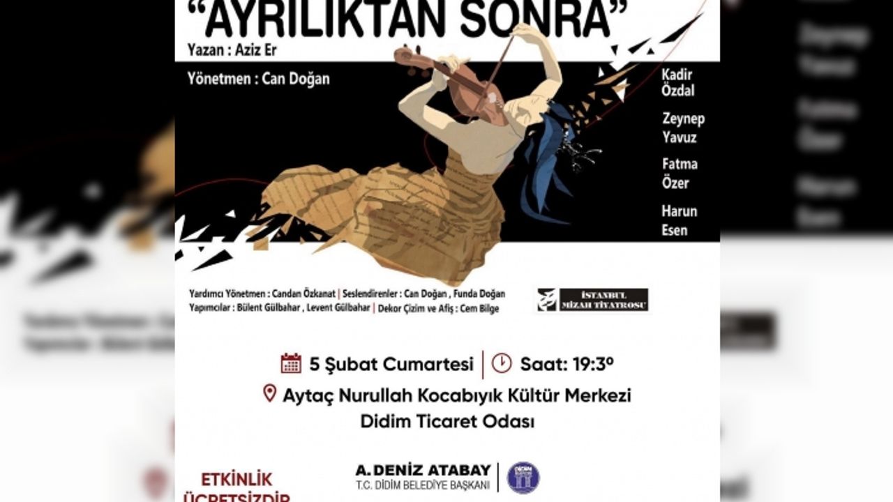 Can Doğan’ın yönettiği Ayrılıktan Sonra isimli tiyatro oyunu Didim Belediyesi tarafından düzenlenen etkinlik kapsamında 5 Şubat Cumartesi günü ücretsiz olarak sahnelenecek.