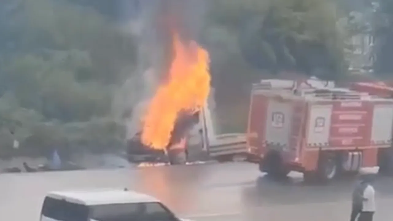 Düzce’nin Akçakoca ilçesinde otomobil yüklendikten kısa süre sonra alev alan çekici, vatandaşların kameralarına yansıdı. Can kaybı ya da yaralanma olmazken itfaiye ve polisin müdahalesiyle yangın söndürüldü.Sefer DEMİR / DÜZCE (İGFA) - Düzce’nin Akçakoca ilçesinde seyir halindeki bir çekici, üzerine otomobil yüklendikten kısa süre sonra alev aldı. O anlar çevredeki vatandaşların cep telefonu kameralarına saniye saniye yansıdı.