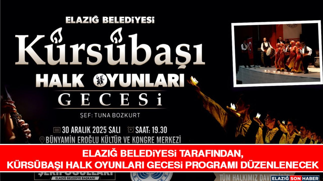 Bu kapsamda Elazığ Belediyesi Kültür, Sanat ve Sosyal İşler Müdürlüğü Musiki Toplulukları tarafından Kürsübaşı Halk Oyunları Gecesi programı gerçekleştirilecek. Etkinlik, 30 Aralık Salı günü saat 19.30'da Bünyamin Eroğlu Kültür ve Kongre Merkezi'nde yapılacak. Musiki Toplulukları Koro Şefi Tuna Bozkurt yönetiminde düzenlenecek programda, Harput musikisinin en güzel örnekleri sunularak, halk oyunları gösterileri sergilenecek.