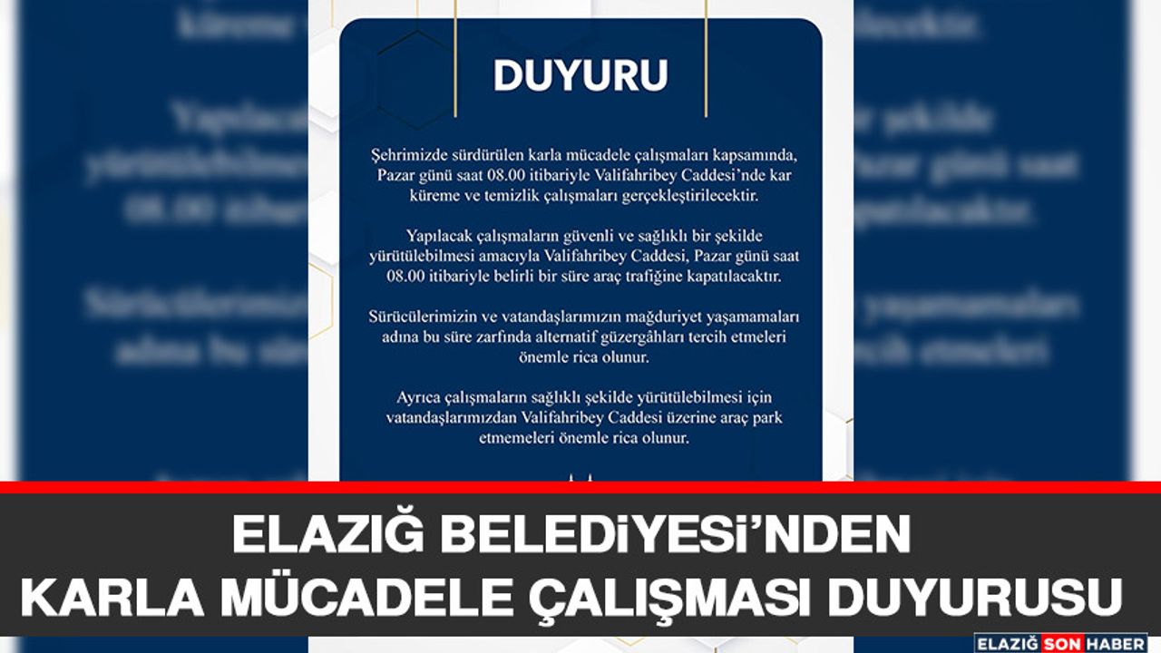 Yapılacak çalışmaların güvenli ve sağlıklı bir şekilde yürütülebilmesi amacıyla Valifahribey Caddesi, Pazar günü saat 08.00 itibariyle belirli bir süre araç trafiğine kapatılacak. Yetkililer, sürücülerin ve vatandaşların mağduriyet yaşamamaları için bu süre zarfında alternatif güzergâhları tercih etmelerini istedi. Ayrıca çalışmaların aksamadan sürdürülebilmesi için vatandaşlardan Valifahribey Caddesi üzerine araç park etmemeleri önemle rica edildi.
