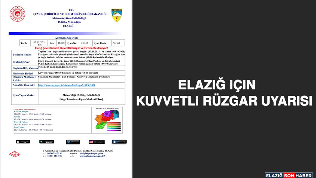 Yapılan değerlendirmelere göre bugün (7 Ekim 2025 Salı) öğle saatlerinden itibaren yarın akşam saatlerine kadar Elazığ genelinde güneyli yönlerden esecek kuvvetli rüzgarın (50-70 km/saat), ilin batı ve doğu kesimlerinde ise yer yer fırtına (60-80 km/saat) şeklinde etkili olması bekleniyor.