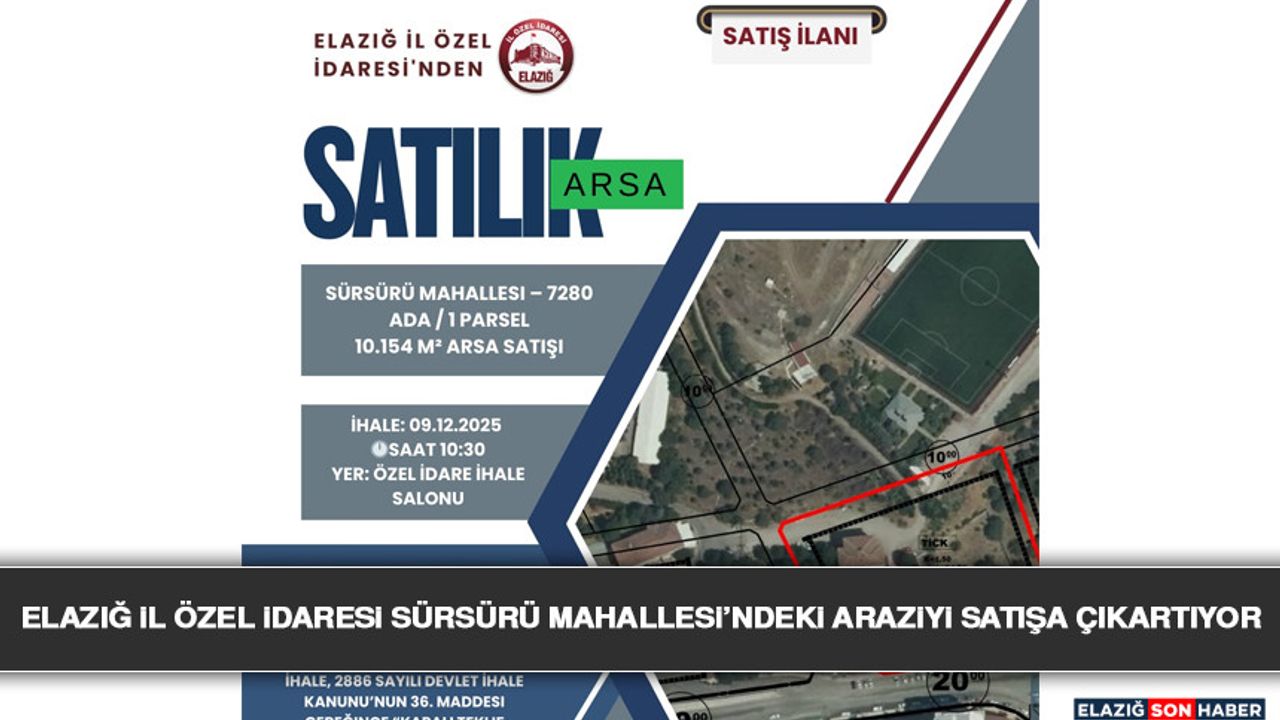 Elazığ İl Özel İdaresi, Sürsürü Mahallesi 7280 ada 1 parselde bulunan 10 bin 154 metrekare büyüklüğündeki arsayı satışa sunacak.