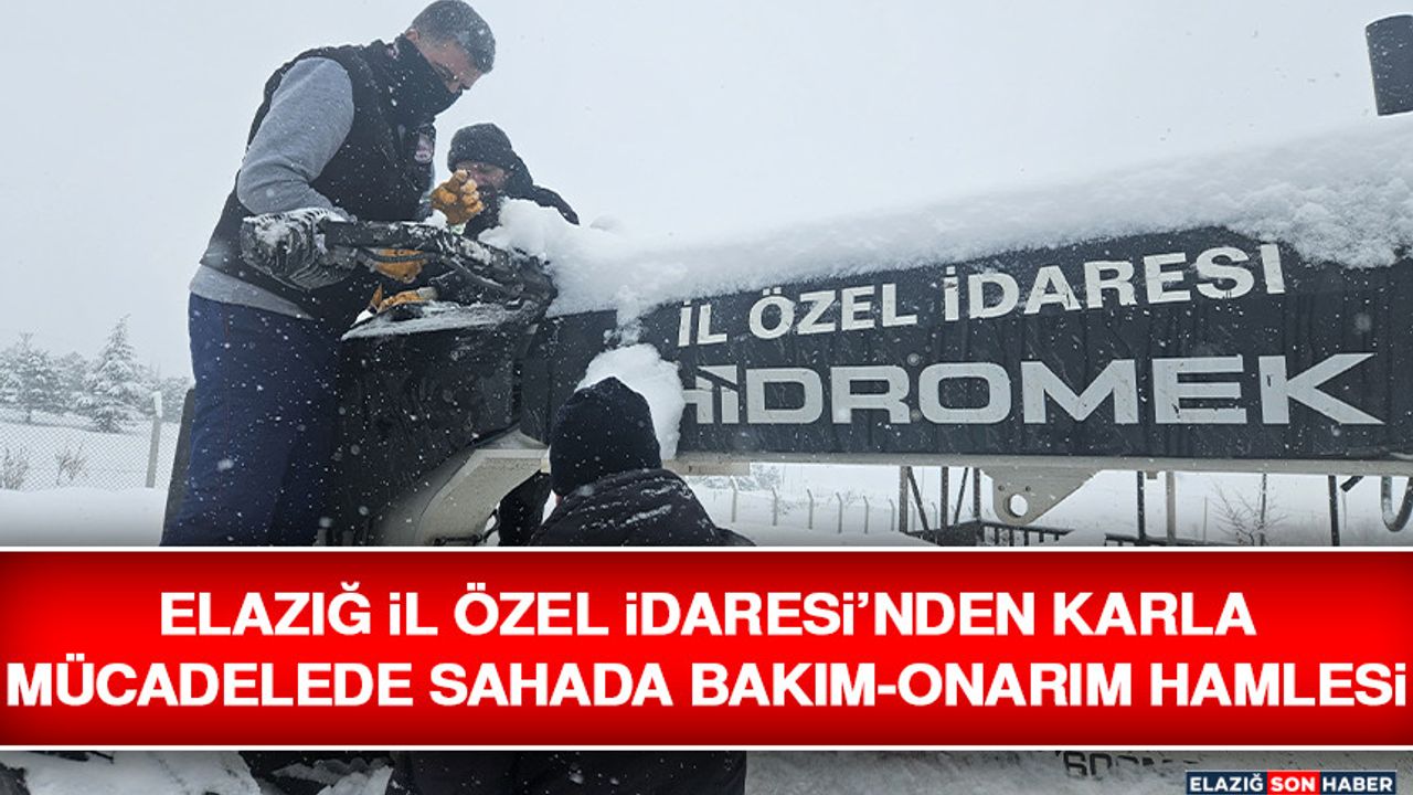 Elazığ İl Özel İdaresi Makine İkmal ve Bakım Onarım Müdürlüğü ekipleri, yoğun kış şartlarının etkili olduğu bölgelerde karla mücadele çalışmalarının kesintisiz sürmesi için araç ve ekipmanlara sahada bakım ve onarım hizmeti veriyor.