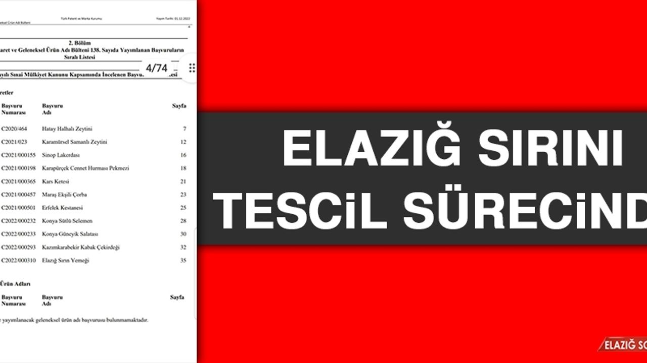 Türk Patent ve Marka Kurumu’nun (TPMK) 01/12/2022 tarih ve 138 Sayılı Bülteninin 35. Sayfasında Elazığ Sırın Yemeğinin C2022/000310 başvuru numarası ile tescil sürecinin başlatıldığı ve bu tarih itibarı ile 3. Ay sonunda ürünün coğrafi tescil belgesinin verileceği duyuruldu.