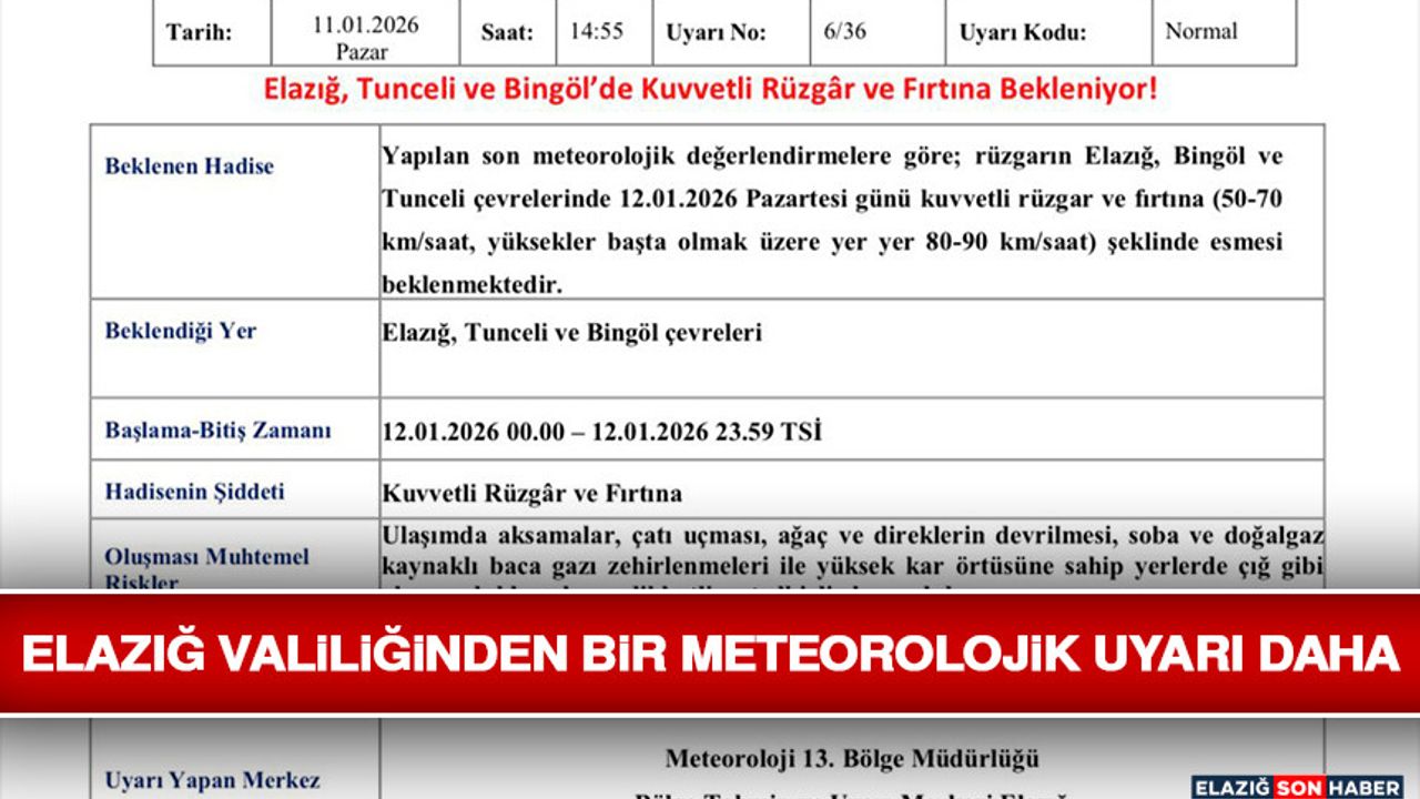 Elazığ Valiliği, yapılan son meteorolojik değerlendirmeler doğrultusunda 12 Ocak Pazartesi günü il genelinde kuvvetli rüzgâr ve yer yer fırtına beklendiğini duyurdu.
