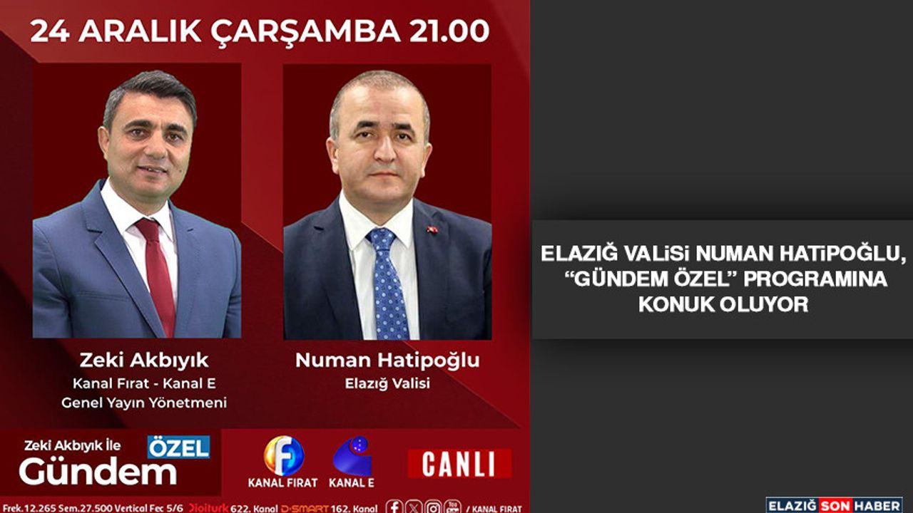 Elazığ Valisi Numan Hatipoğlu, Kanal Fırat ve Kanal E ekranlarında yayınlanan, Televizyonlarımız Genel Yayın Yönetmeni Zeki Akbıyık tarafından hazırlanan “Zeki Akbıyık ile Gündem Özel” programına konuk olacak.