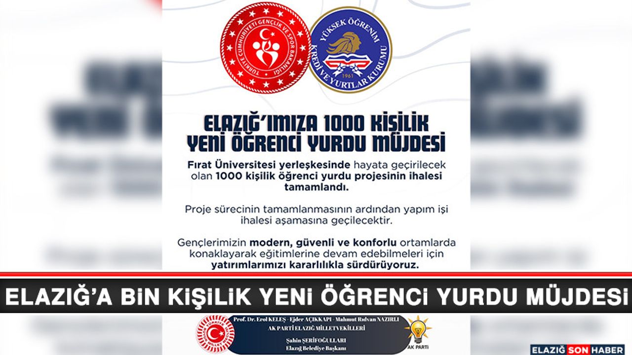 “Fırat Üniversitesi yerleşkesinde hayata geçirilecek olan 1000 kişilik öğrenci yurdu projesinin ihalesi tamamlandı. Proje sürecinin tamamlanmasının ardından yapım işi ihalesi aşamasına geçilecektir.