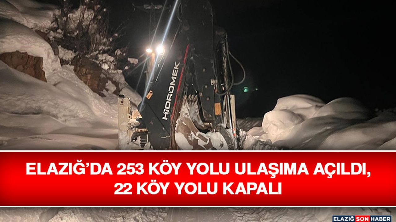Toplam 546 köy yolunun bulunduğu Elazığ’da, gün içerisinde 253 köy yolu iş makineleriyle temizlenerek ulaşıma açıldı. Şu an itibarıyla kapalı köy yolu sayısı ise 22 olarak açıklandı.