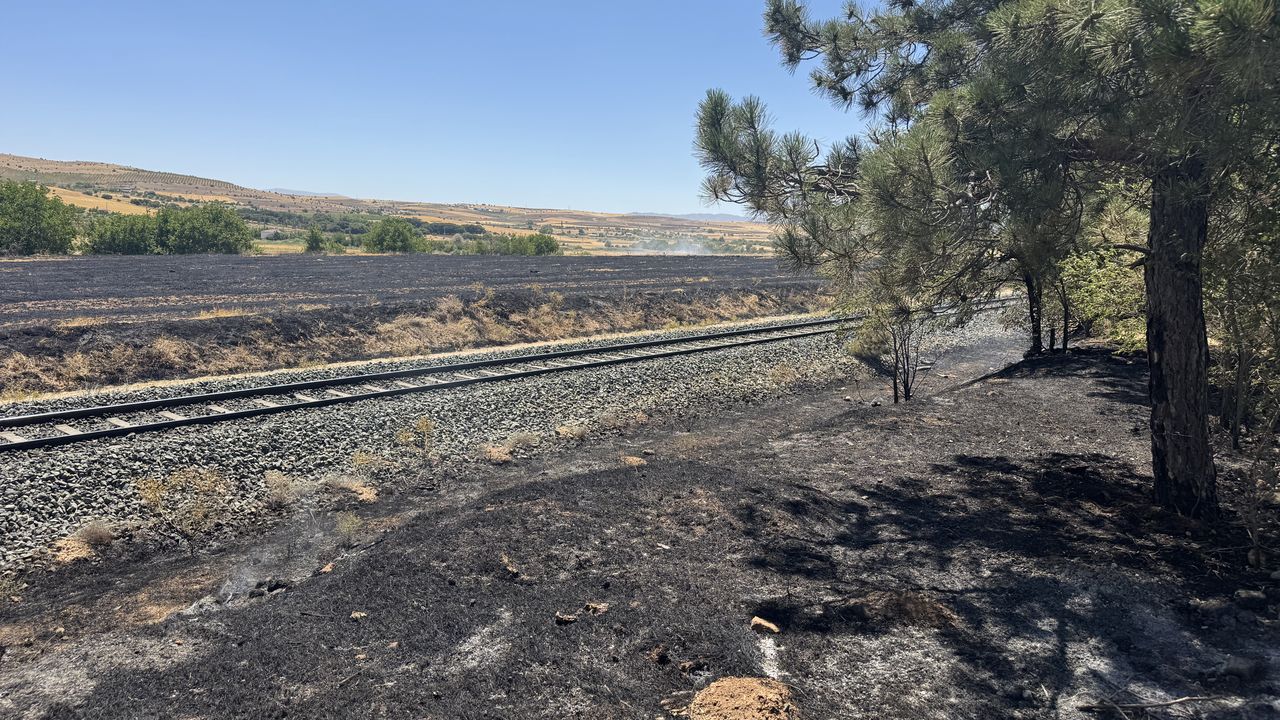 Rüzgarın etkisiyle kısa sürede yayılan yangın, demir yolu çevresindeki ağaçlık alana da sıçradı.