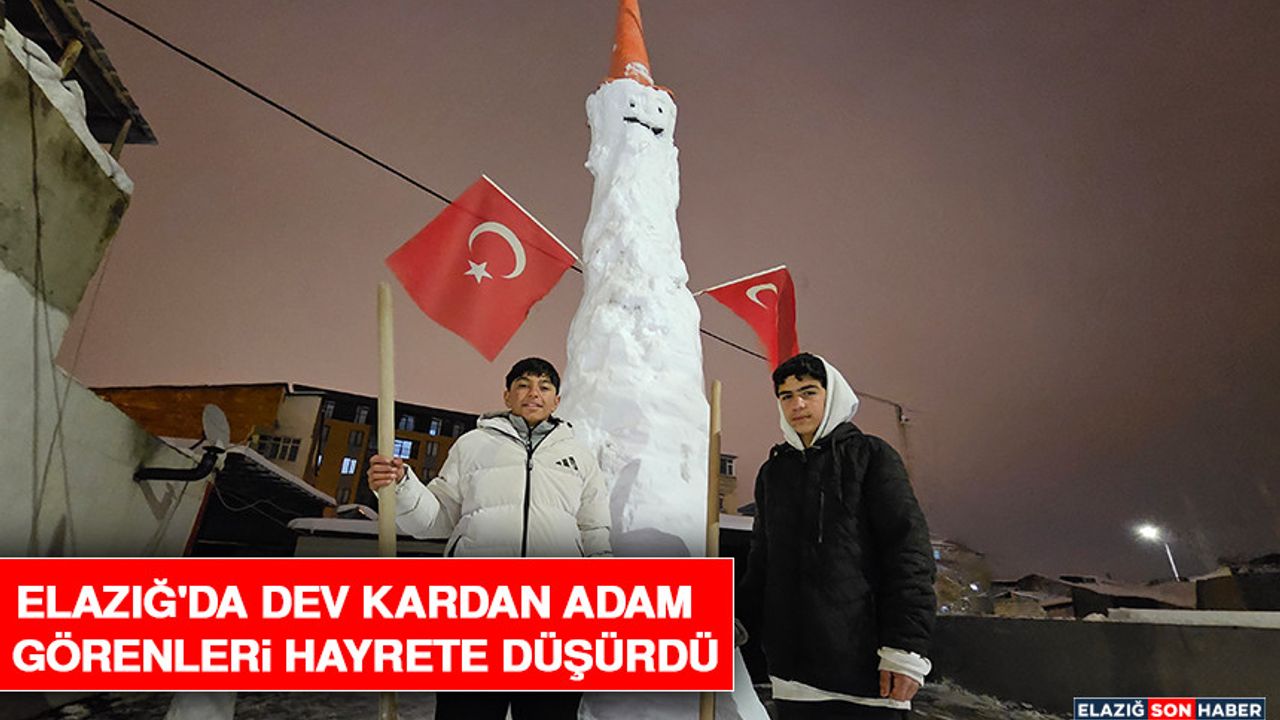 Elazığ'ın Rüstempaşa Mahallesi'nde iki arkadaşın yaptığı dev kardan adam görenlerin ilgisini çekti. Yoğun kar yağışını fırsata çeviren 13 yaşındaki Beytullah Gezer ile 14 yaşındaki Arda Erulaş, yaklaşık 4,5 metre uzunluğunda kardan adam yaptı. Kardan adamı görenler hayrete düştü.
