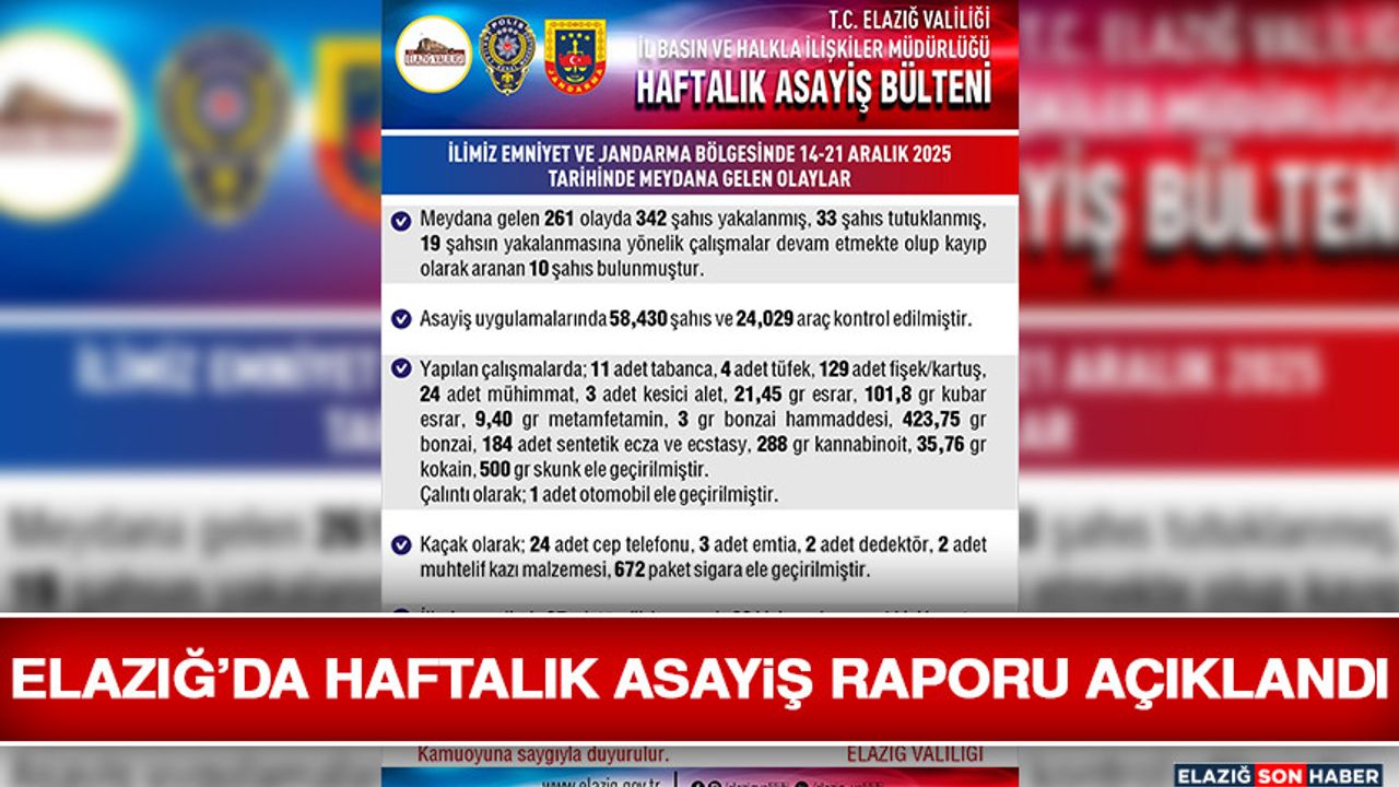 Elazığ Valiliği İl Basın ve Halkla İlişkiler Müdürlüğü tarafından paylaşılan haftalık asayiş bültenine göre, şehrin huzur ve güvenliğini sağlamak amacıyla yürütülen operasyonlar devam ediyor.