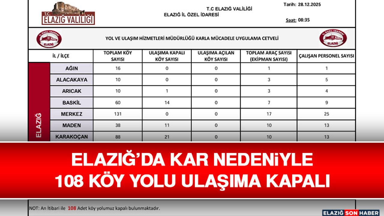 Elazığ Valiliği İl Özel İdaresi Yol ve Ulaşım Hizmetleri Müdürlüğü tarafından paylaşılan 28 Aralık saat 08.35 itibarıyla hazırlanan karla mücadele uygulama cetveline göre, il genelinde 108 köy yolu ulaşıma kapalı bulunuyor.