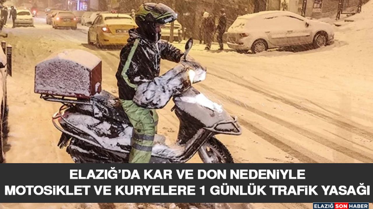 Elazığ Valiliği’nden yapılan açıklamada, "19 Ocak 2026 Pazartesi günü, ilimizde etkili olan yoğun kar yağışı, don olayı ve olumsuz hava koşulları nedeniyle trafik güvenliğinin sağlanması amacıyla ilave tedbirler alınmıştır. Bu kapsamda; İl genelinde motosiklet, motorlu bisiklet (mobilet) ve motorlu kurye faaliyetlerinin can ve mal güvenliğini tehlikeye düşürebileceği değerlendirilmiş olup, 1 (bir) gün süreyle trafiğe çıkışları yasaklanmıştır. Vatandaşlarımızın alınan tedbirlere uymaları ve yetkili mercilerin yapacağı duyuruları takip etmeleri önemle rica olunur" denildi.