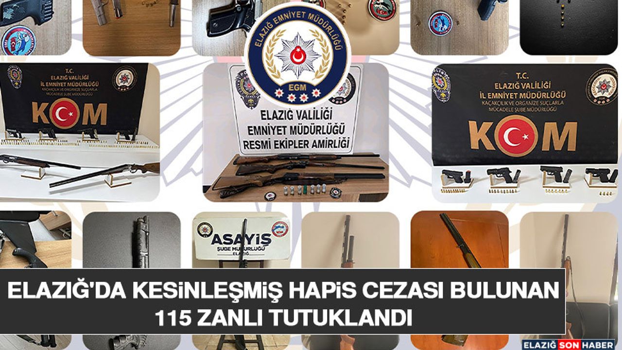 Elazığ Cumhuriyet Başsavcılığı koordinesinde İl Emniyet Müdürlüğü Asayiş, KOM, Narkotik ve Çocuk Şube Müdürlükleri tarafından kentin huzur ve güvenliğini sağlamaya yönelik çalışmalar aralıksız devam ediyor. Edinilen bilgiye göre, son bir ay içerisinde yürütülen saha faaliyetlerinde, kesinleşmiş hapis cezası ile aranan toplam 115 şahıs yakalanarak gözaltına alındı. Emniyet Müdürlüğündeki işlemlerinin ardından adli makamlara sevk edilen 115 şahıs, tutuklanarak cezaevine gönderildi.