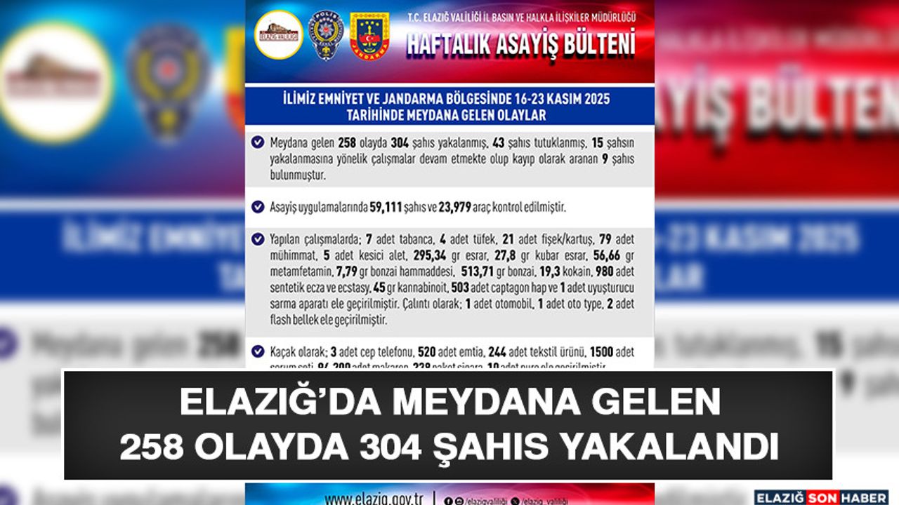 Elazığ Valiliği, 16-23 Kasım 2025 tarihleri arasındaki haftalık asayiş verilerini açıkladı. Kent genelinde meydana gelen 258 olayda 304 şüpheli yakalanırken, 43 kişi tutuklandı.