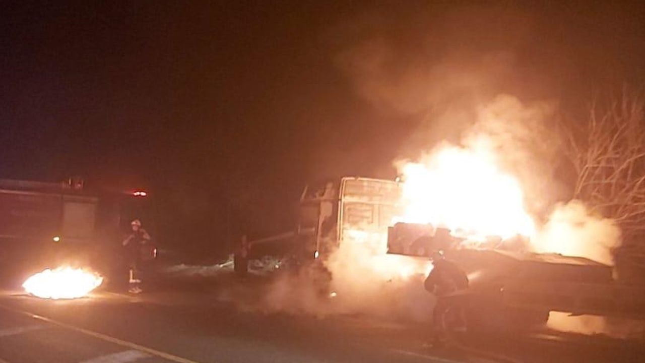 Elazığ-Malatya kara yolunun 40'ıncı kilometresinde, sürücüsü ve plakası henüz öğrenilemeyen hareket halindeki tırın motor bölümü alev aldı.