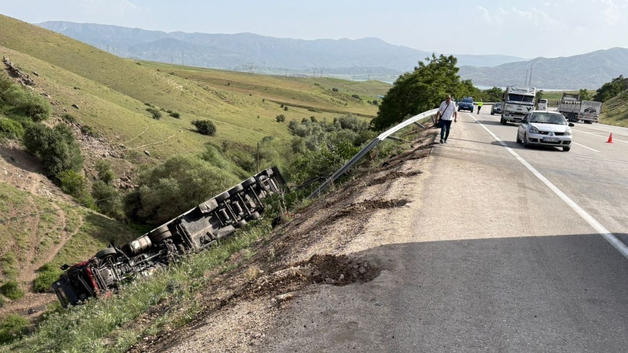 Çarpışmanın etkisiyle tır yol kenarına devrildi.