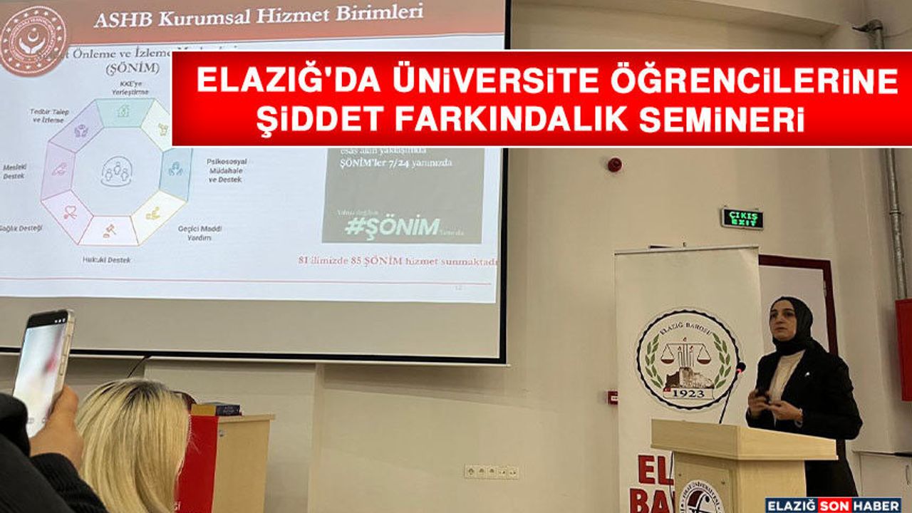 Elazığ Aile ve Sosyal Hizmetler İl Müdürlüğü tarafından, kadına yönelik hizmetlerde önemli paydaş kurumlarla iş birliği içinde "Aile ve Nüfus On Yılı" çalışmaları kapsamında "Şiddet Farkındalık" semineri düzenlendi. Seminer; Fırat Üniversitesi Kadın ve Aile Çalışmaları Uygulama ve Araştırma Merkezi, Elazığ Barosu ile Elazığ Rehberlik ve Araştırma Merkezi iş birliğiyle gerçekleştirildi. Program, Fırat Üniversitesi İletişim Fakültesi öğrencilerine yönelik olarak düzenlendi.