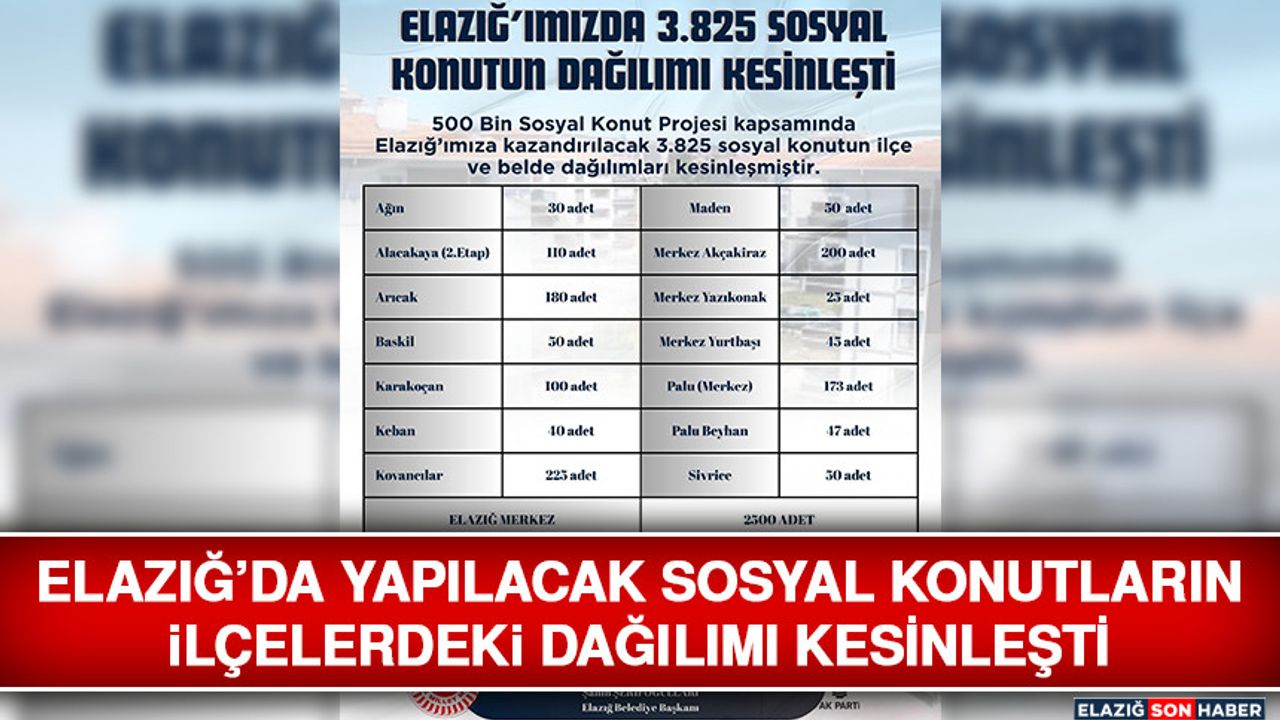 AK Parti Elazığ Milletvekilleri Erol Keleş, Ejder Açıkkapı, Mahmut Rıdvan Nazırlı ve Belediye Başkanı Şahin Şerifoğulları tarafından sosyal medyadan yapılan ortak paylaşımda ise konutların ilçelerdeki paylaşımı da açıklandı. Bu kapsamda merkezde 2500 konut, ilçelerde ise 1325 konut yapılacak.