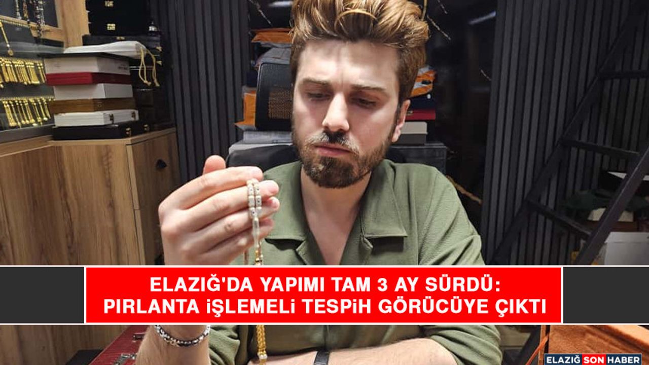 Elazığ'da tespih ustası Hadin Bulut tarafından sipariş üzerine ilk defa yapılan pırlanta işlemeli ve altın püsküllü fil dişi tespih, 3 aylık yapım ve işleme süresinin ardından tamamlandı. 3,5 karat pırlantanın ve 5.97 gram altının kullanıldığı fil dişi tespih, görüntüsü ile de dikkat çekiyor.