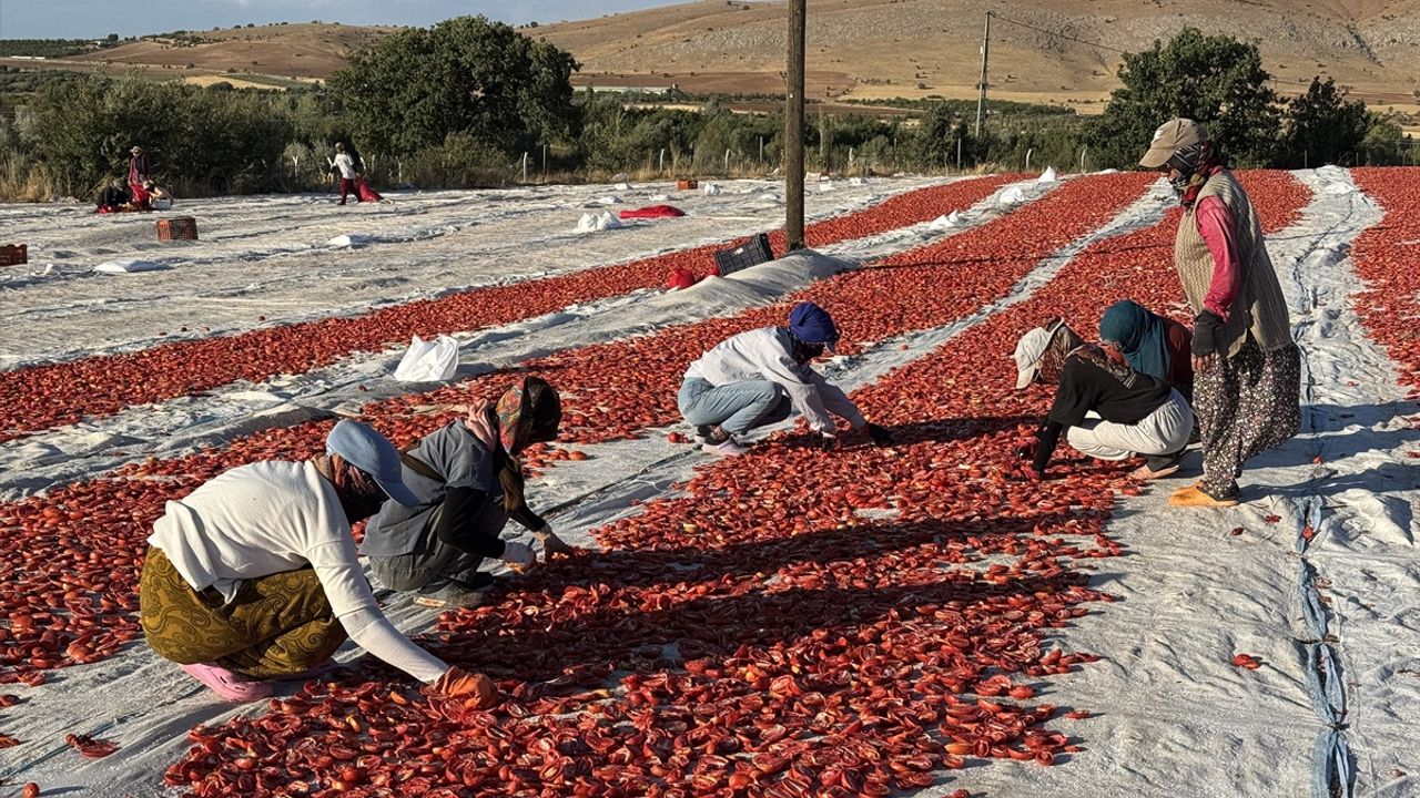 Çoğunluğu kadınlardan oluşan mevsimlik tarım işçilerinin yoğun emeğiyle hasadı yapılan ve kurutulacağı alana getirilen domatesler ikiye bölünüp tuzlanarak beze serilip güneşte kurutuluyor.