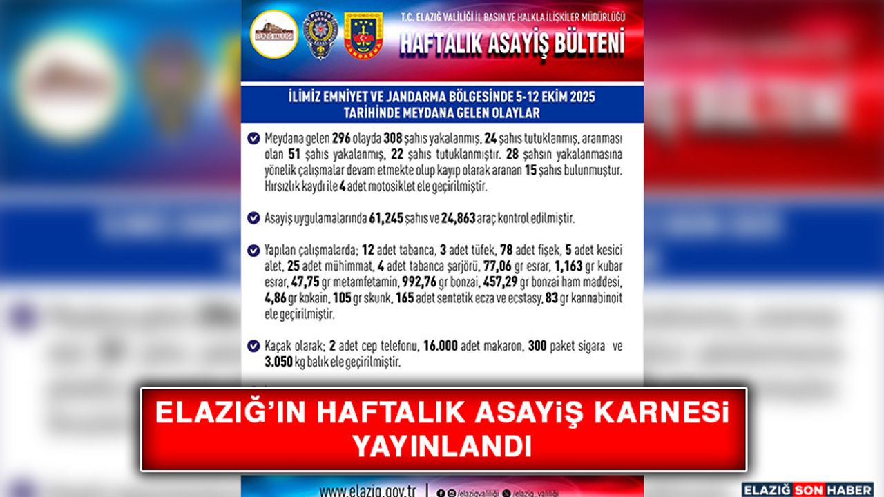 Paylaşılan verilere göre Elazığ genelinde 1 haftalık süreçte 296 olay meydana geldi. Bu olaylarda 308 şahıs yakalanırken 24 şahıs tutuklandı. Kent genelinde yapılan kontrollerde araması olan 15 şahıs yakalanmıştır.