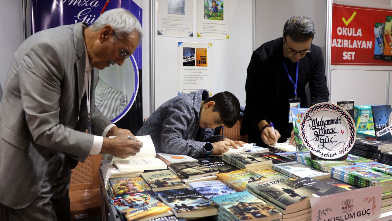 Elazığ Belediyesince Ahmet Tevfik Ozan Fuar ve Kongre Merkezi'nde 22 Kasım'da açılışı yapılan ve 30 Kasım'a kadar sürecek 6. Kitap Fuarı'nda emekli öğretmen Müslüm Güç (72), oğlu coğrafya öğretmeni Serkan Güç (46) ve 10 yaşındaki torunu Muhammed Miraç Güç aynı stantta okurlarıyla bir araya geliyor.
